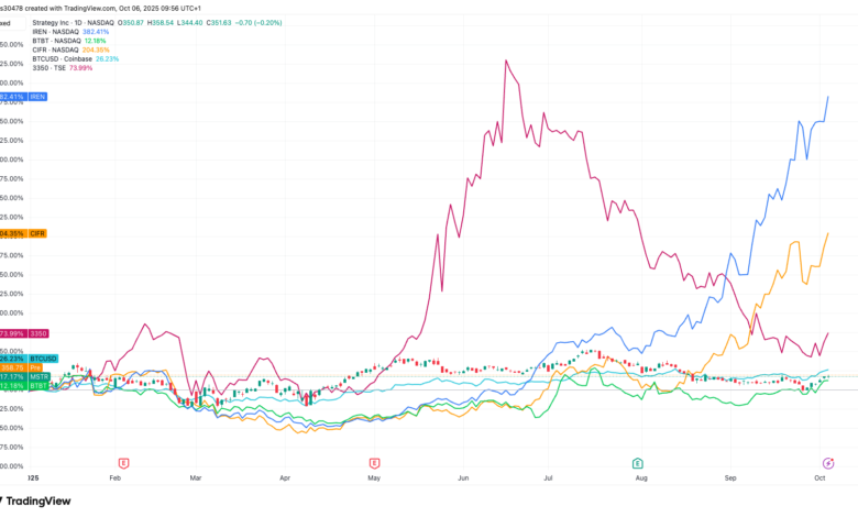 So far this year, crypto -related stocks are different: Iris Energy (Iren) has moved by 382%, Cipher Mining (CIFR) 205%, Metaplanet 74%, Microstrategy (MSTR) 17%, and Bit Digital (BTBT) 12%.
