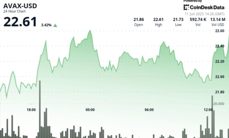 Avax has reached 4% in the last 24 hours, raising CoinDesk 20 – an index of the top 20 cryptocurrencies by market capitalization, excluding stablecoins, memecoins and exchange coins – which rose 2.5% over the same period.