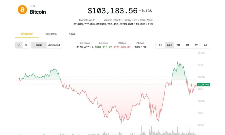 Bitcoin withdrew to 101,000 dollars early in the American session before more than $ 103,000 recovered later, modestly over the past 24 hours.