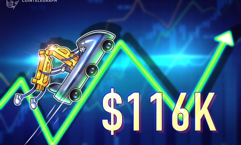 Data from Cointelegraph Markets Pro and TradingView Tracked a 1.6% daily BTC price reversal taking BTC/USD to $116,077 on bitstamp.
