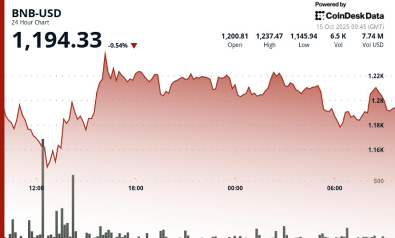 BNB exchanged $ 1,200 on Wednesday, down 0.5% after sliding from a new high time That came after a broad market exacerbation event had removed nearly $ 500 billion from the crypto market.
