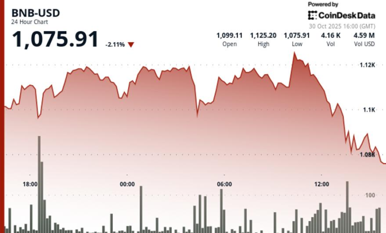 BNB is down more than 2% in the past 24 hours, falling to $1,073 after failing to hold key technical support around $1,095 according to Coindesk Research’s technical analysis data model.