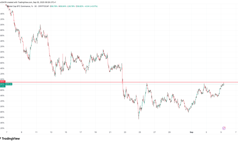 BTC is close to $ 113k while dominance rises to 59%, a two -week high