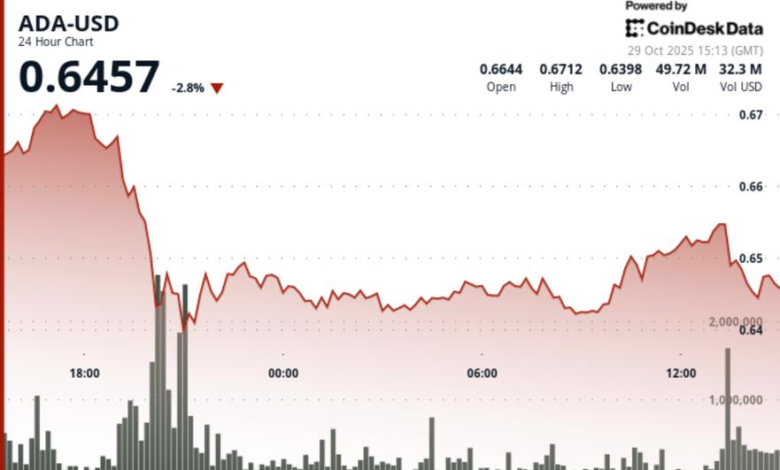The breakdown began on Tuesday, when trading volume spiked 67% above the 24-hour average. Almost 183 million tokens changed hands as ADA slipped below 64.5 cents, triggering sales and setting a move towards lower support zones.