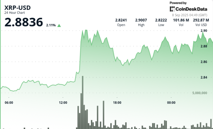 The XRP jumped sharply in the Monday session, up from $ 2.83 to $ 2.88 as a breakout push that tried $ 2.92 to six folded average volume. The bulls will be held above the $ 2.86 support, but repeated denial of the $ 2.90- $ 2.92 turned upside down momentum. With Fed Rate Cut Bets close to 100% leading September 17 meeting, institutional flows remain strong -leaving the token integration -including just under critical resistance.