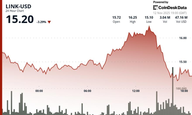 The advance initially sent the link higher, testing resistance near $16.25, Coindesk Research’s technical analysis model said. But the move triggered aggressive selling, with 3.36 million tokens traded during 16:00 UTC time, 138% above the 24-hour average, sending the link to a session low of $15.10, according to Coindesk data.