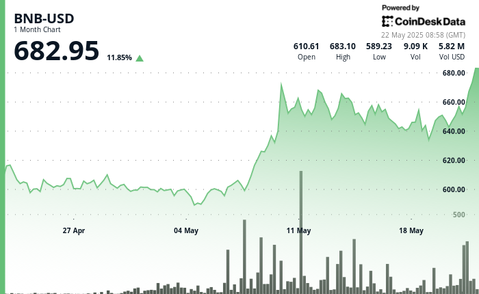 Technical indicators remain bullish for BNB, with strong support established at $ 682 and many tests at this level showing the consumer’s prolonged interests despite minor resistance to around $ 684, according to the technical review model of technical research of CoinDesk Research.