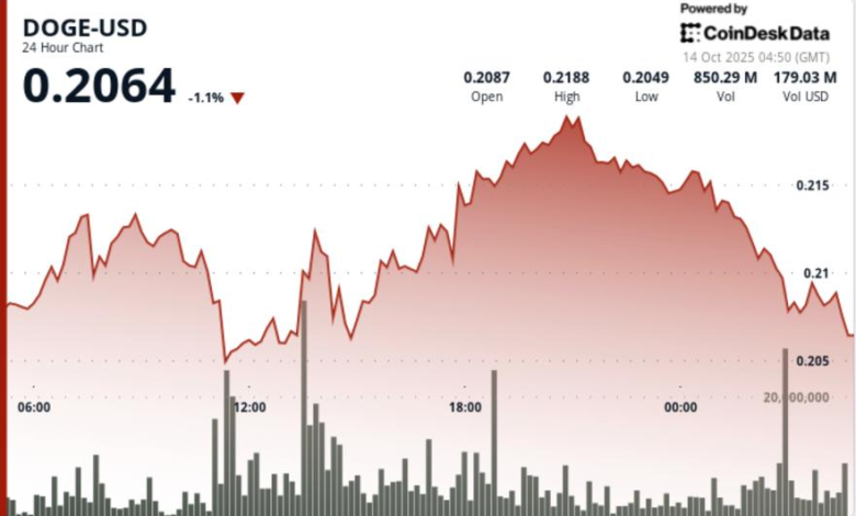 Dogecoin exchanged PABAGU -CHANGE of PABAGU -change of October 13-14 session, slipping 1% after failing to maintain a breakout above $ 0.22. The token found strong demand close to $ 0.20 as institutional flows continued, even though the broader markets react to transferring trade rhetoric and updated regulatory reviews following the House of Doge’s Nasdaq’s Debut.