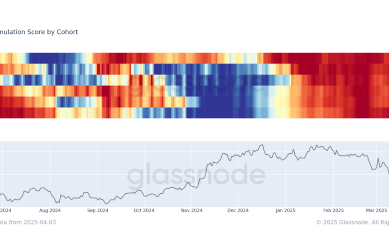 Despite this renewed whale activity, broader market behavior remains bearish, with bitcoin currently down 25% from its all-time high. Glassnode’s Accumulation Trend Score, which tracks the behavior of different wallet cohorts over a 15-day window, shows that most other investor groups are still in distribution mode.