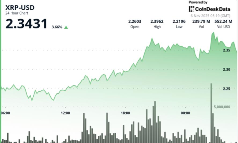 XRP rallied 4.9% to $2.35 in Tuesday’s session, breaking key $2.30 resistance on near-double institutional volume. The move marked the token’s strongest daily gain in a week and hedged against a decline in the broader market, with traders now eyeing a clean push towards $2.50.