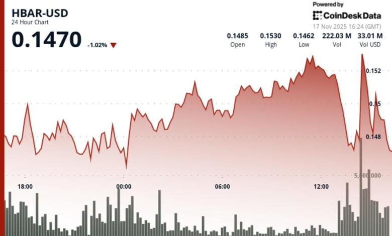 Short-term charts show an acceleration, with HBAR dropping another 2.2% to $0.1472 as volume surged 180% above normal. A series of lower highs carved out a clear descending channel, reinforcing the technical picture traders used in short time setups.