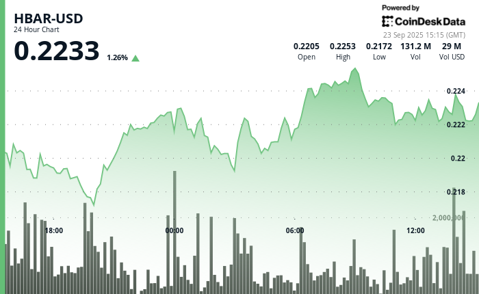 HBAR saw a volatile 23-hour stretch between Sept. 22 to 15:00 and September 23 and 14:00, with the token trade in a narrow band between $ 0.217129 and $ 0.225507. The session opened with a sharp sale that dragged prices to $ 0.217408 before the heavy purchase activity was restored the momentum.