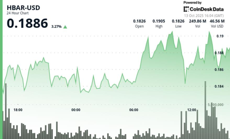HBAR (Hedera Hashgraph) experienced pronounced volatility at the last time of trading on October 13, emerging from $ 0.187 to a peak of $ 0.191 – a 2.14% intraday gain – before the integration – with around $ 0.190.