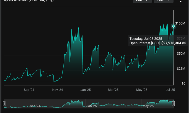 The so -called notional open interest (Hey) has risen to nearly $ 98 million from $ 71 million since June 27 quarterly expiry, a solid 38% increase in two weeks. It is close to June 24 records of $ 102.3 million, according to Data derivit metrics. In the terms of the contract, the OI rose 26% to 42,414. (The Multiplier of the contract for XRP in the deribit is 1,000 XRP).