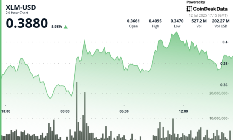- Stellar’s XLM token recorded significant price appreciation within a 24-hour trading period from July 11 to 17:00 UTC to July 12 at 16:00 UTC, with shares moving within a $ 0.071 range representing approximately 20.59% volatility between a session of less than $ 0.345 and high $ 0.416 of the review of technical research research by CoinDesk.