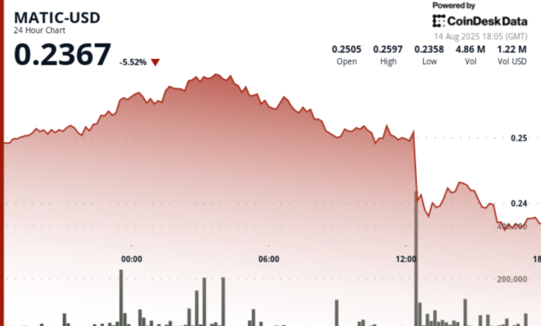 Pol exchanged with a broad 10% range in the past 24 hours, climbing from $ 0.25 to $ 0.26 in early trading before the back of sharp, data from CoinDesk Analytics shows.