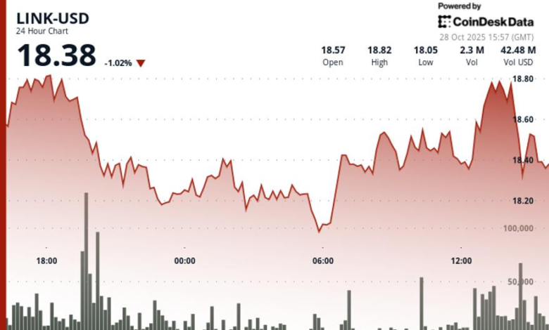 Oracle Network Chainlink’s native token was trading just above $18 in a volatile Tuesday session amid momentum in real-world adoption.