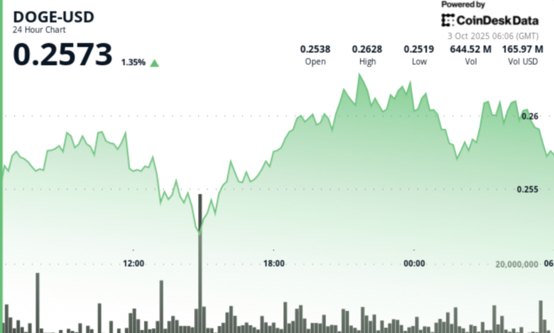 The Doge exchanged between $ 0.251 and $ 0.264 from October 2, 04:00 to October 3, 03:00, posting a 2.7% net gain after navigating both corrections and recovery phases. Analysts point to institutional desks as dominant flow drivers, with the SBI and ETF speculation that maintains a broader interest in the bid. Technical specialists highlighted an emerging megaphone pattern and hidden bullish variations, suggesting potential reversal remains despite short-term sales pressure.