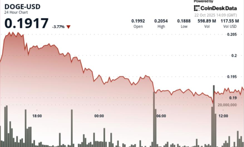Dogecoin fell 2% in the past 24 hours to $0.1910, slipping from an intraday high of $0.1953 as selling pressure capped momentum across the broader market. Trading activity climbed 29% above the seven-day average, signaling active positioning by institutional desks rather than retail exits.