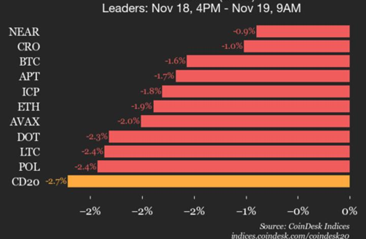 Coindesk 20 is currently trading at 2948.21, down 2.7% (-82.39) since 4 pm ET on Tuesday.