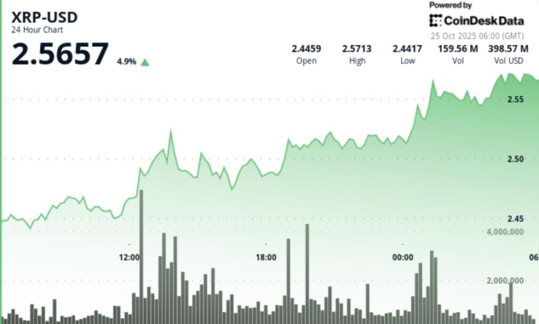 - XRP climbed from $2.50 to $2.57 throughout the session, with intraday volume peeking at 142 million—31% above its seven-day mean.