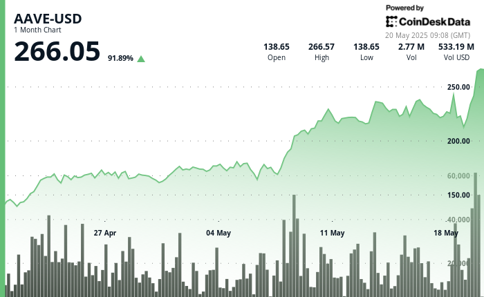 AAVE’s explosive rally broke through multiple resistance levels with increasing trading volume, particularly during the late-night hours when it surpassed the $250 psychological barrier.