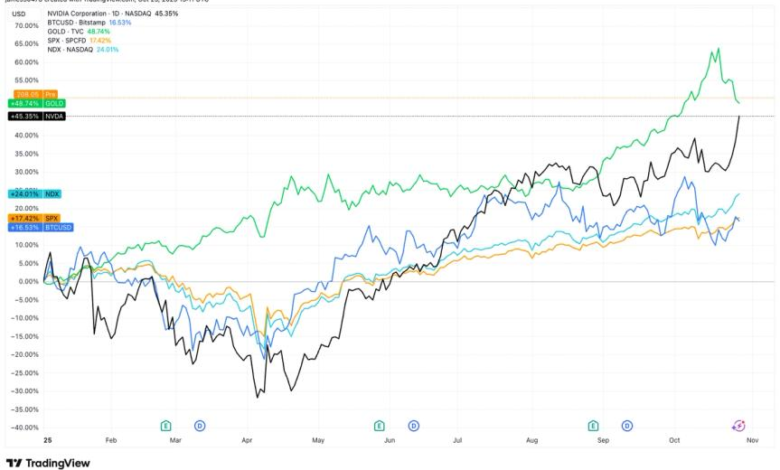 In further gains on Tuesday as Bitcoin dipped, the S&P 500’s 17% year-to-date gain was ahead of BTC’s 16% advance. The NASDAQ extended its lead over Bitcoin, which is now 24% higher. Gold continued to be the top performing major asset class with a 50% gain.
