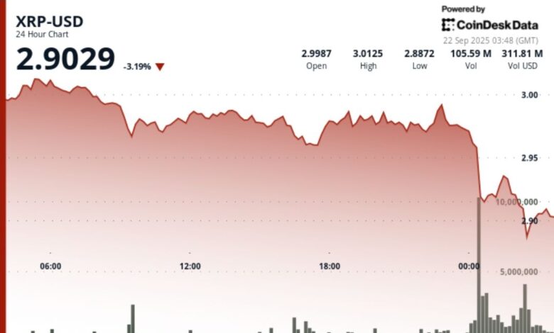 • XRP crashes from $ 2.87 to $ 2.77 to a 24-hour length (Sep 22 03: 00 – Sep 23 02:00 GMT)a 4.9% collapse at a range of $ 0.14.