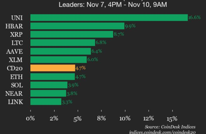 Leaders: uni (+16.6%) and HBAR (+9.9%).
