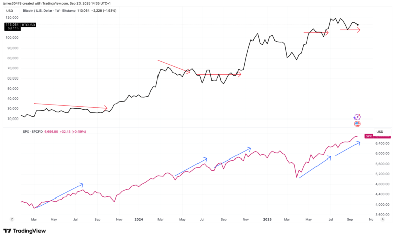 As for the latest difference, the S&P 500 since May continued to move, while Bitcoin combined within $ 110,000 to $ 120,000 range. Bitcoin collapsed before all the time high in August, but the gains quickly returned, with the BTC returning to the low end of its previous range.