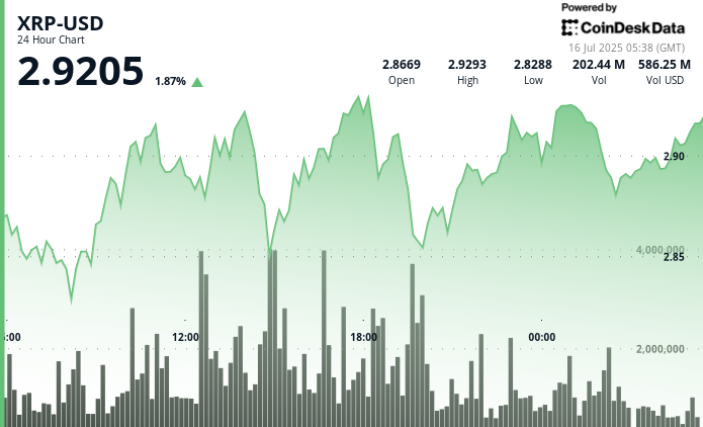 - XRP exchanged a narrow 4.08% range between $ 2.82 and $ 2.93 from July 15 04:00 to July 16 03:00, which closed $ 2.89 for a 1.8% day -day gain.