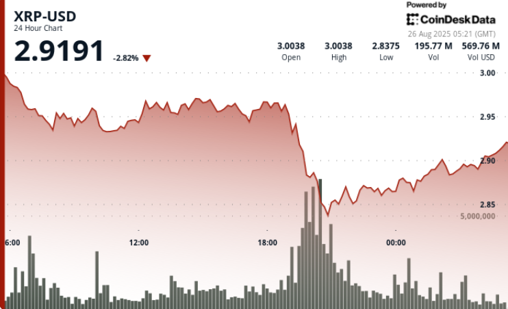 The XRP faces steep swings in the August 25-26 trading window, slipping from $ 3.01 to $ 2.91 for a 3.2% loss. A explosion of institutional extermination during the 19: 00–20: 00 GMT hour pushed to sharp collapse, with volumes tripling daily averages. The late session recovery attempts returned to the token above $ 2.90, but the market remains divided into if the reversal momentum can be maintained.